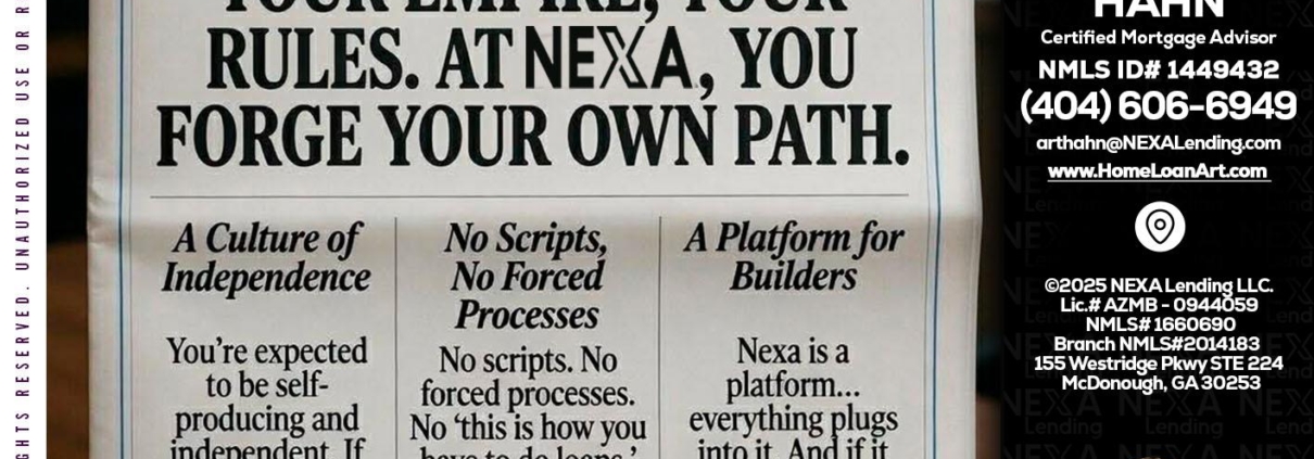 Hi, my name is Arthur Hahn. I’m a Loan Officer with NEXA Lending LLC., offering personalized mortgage solutions, fast customized quotes, great rates and service with integrity.