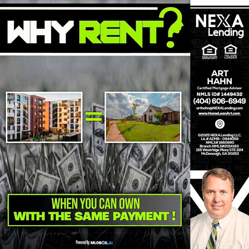 WHY RENT? - Arthur Hahn -Mortgage Loan OriginatorAre you tired of renting? Are you tired of paying someone else’s mortgage but not yours? If Yes, then contact me and we can change that, starting today.